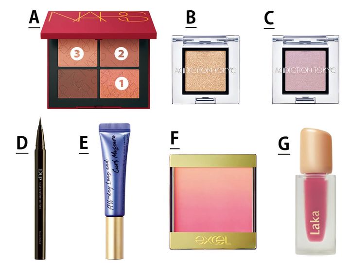 A NARS ライトリフティング クワッドアイシャドー 03732 ¥7,150(限定色)/NARS JAPAN B•C アディクション ザ アイシャドウ パール 034P、同・035P 各¥2,200/アディクション ビューティ D ディーアップ シルキーリキッドアイライナーWP ブラウンブラック ¥1,430/ディー・アップ E ミルクタッチ オールデイ ロング アンド カール マスカラ ミッドナイト ブルー ¥1,628/Coogee F エクセル オーラティック ブラッシュ AB01 ¥1,980/常盤薬品工業 G Laka フルーティーグラムティント105 ¥1,980/アリエルトレーディング