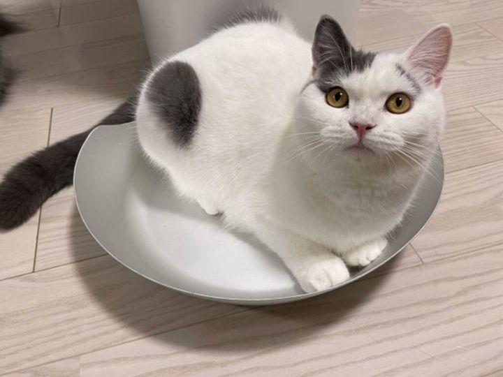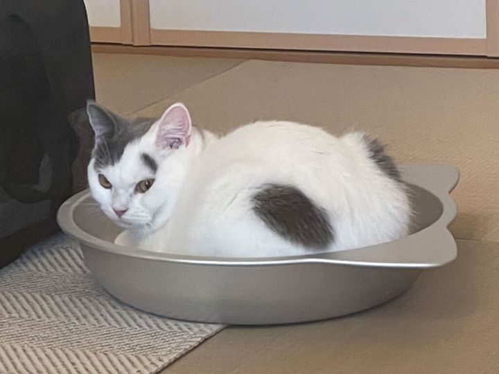 そして、ボクは用意されていた、ねこ鍋に移動。まだまだ気は抜けないから、威嚇しておくか。ギロリと。あれ? 眉毛のせいで困ってる感じになってる? 主「1日で慣れましたね」