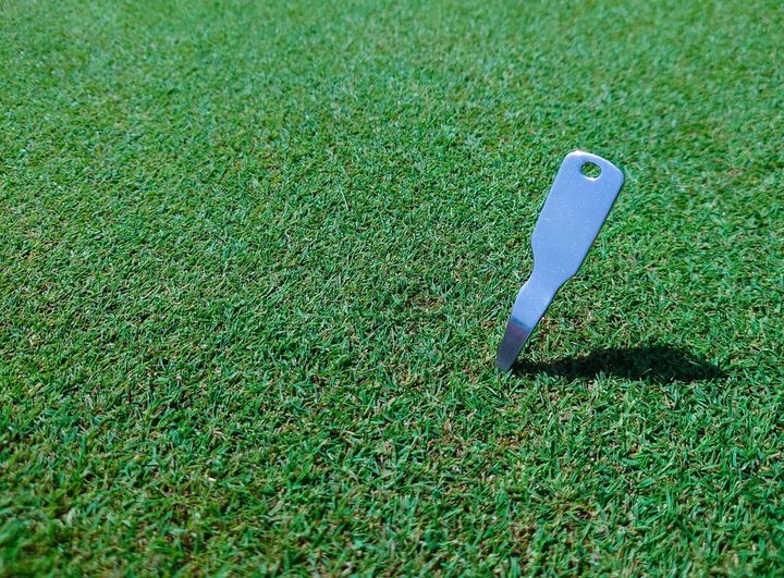 グリーンにボールが落下した時にできる「ボールマーク(ball mark)」。「ピッチマーク(pitch mark)」とも呼ばれます。ボールマークは、そのまま放っておくと凹んだところにそのまま芝が生えてきてしまうため、グリーンが凸凹になってしまいます。硬いグリーンであれば、ボールマークがつかないことも。でも、柔らかいグリーンの時は、芝生が捲れあがる、もしくは完全に芝がはがれてしまってえぐれたようになってしまうなんてことも。それを直すための道具が、グリーンフォークです。