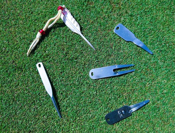 刃を収納できる折り畳み式のものや、帽子やパターカバーにつけておけるもの、ティと一体型のものも。ワンプッシュで取り外しができるカラビナ仕様になっていたり、クリップがついていてバッグやベルトループに取り付けることができるものもあります。シューズに収納できるものも見たことがあります。
