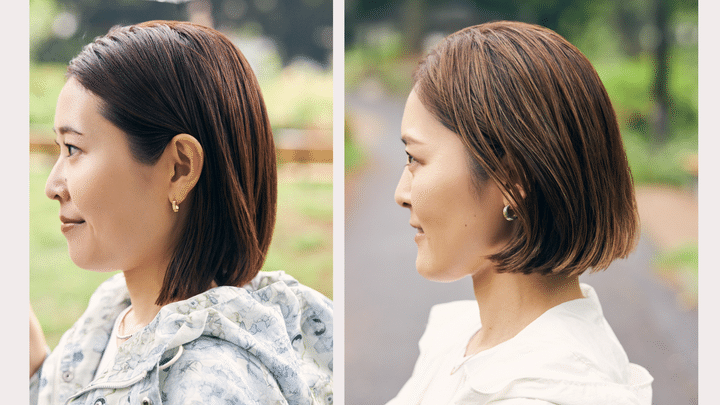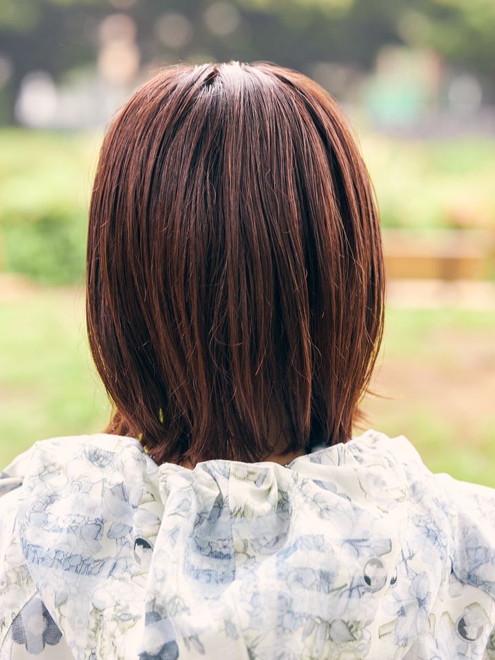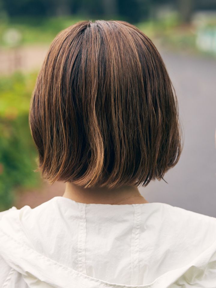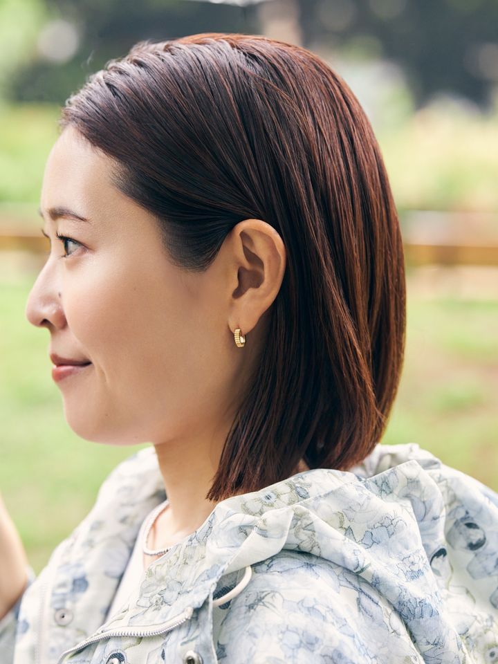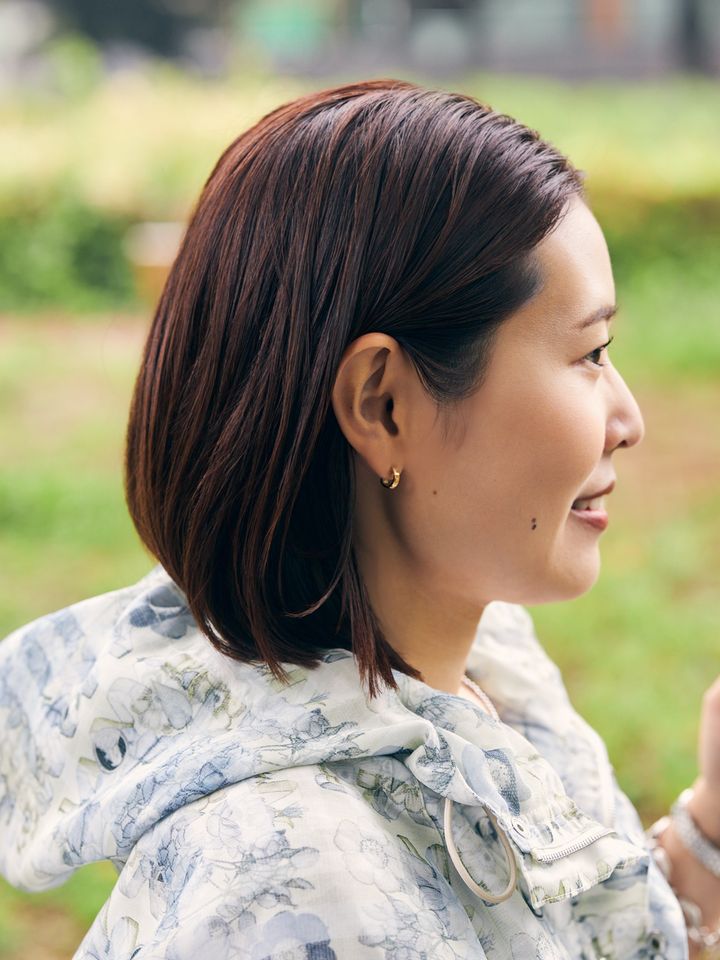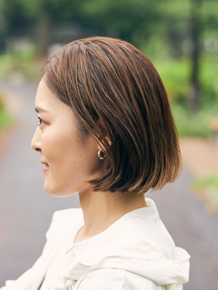 「白髪が目立つようになってきたので、ハイライトをすごく細かく入れてもらってカムフラージュ。オリーブ系やくすみブルー、ラベンダーなどのカラーを入れて立体感を出してもらっています。カットはいつも重めの切りっぱなしボブをオーダー。乾かす時間やお手入れ、朝のセットが短時間で済むのに、こなれ感が出る気がしています。スタイリング剤はN. ポリッシュオイルを使用しているのですが、毛の量が多いので気持ち多めにプッシュし、根元によく揉み込んでなじませてべたついて見えないように気を付けています」加藤綾美さん・会社員/164㎝(3歳と7歳男の子ママ)