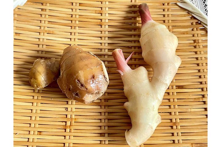 新しい根が白くぷっくりと肥大し、先の方は鮮やかな紅色をしています。収穫してすぐに出荷されるため水分が多めで、おだやかな辛み。根をスライスして天ぷらにしたり、針しょうが(極薄せん切り)にして炊きたてのごはんに混ぜても。アントシアニン色素が含まれていて、甘酢漬けにすると美しいピンク色に発色します。食品成分表では根しょうがよりも、体内の水分調整や細胞の成長やホルモン生成を助ける働きのあるミネラル(カリウム、亜鉛、マンガン)が多め。