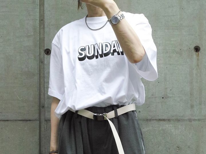 「〈サンデー〉のTシャツは今回ロゴをちょっと遊んでいて、よく見ると少し歪んでいたりします。大人が着たいロゴTを毎シーズン作っているのですが、厚すぎず薄すぎない生地と、ネックのリブがポイント。今回のTシャツは色違いの黒も気に入っています」Tシャツ¥7,700(ジャーナル スタンダード ラックス)