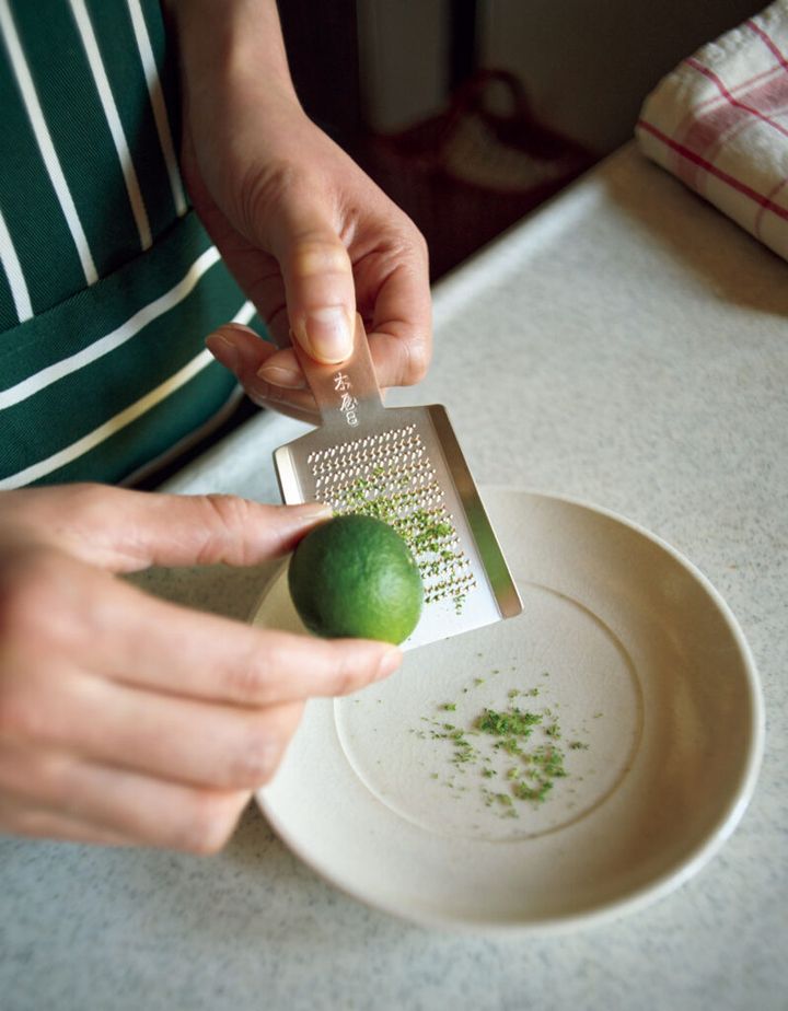 いい調理道具を探そうと思ったら、まず覗くのは創業230年を超える老舗『日本橋木屋』。代名詞の包丁さながらに、おろし金も使い心地が抜群にいい。錫のメッキを施した純銅の板に、職人がタガネと金づちでひと目ひと目、刃を立てて製作。手作業ゆえに生まれる、鋭く、不規則な目のおかげでさっとおろせる。小さな柑橘用にぴったりなサイズ「#8」は手のひらに収まるほどの大きさで、使ううちに愛らしく思えてきた。[W56×H93㎜]¥2,530(日本橋木屋 本店 03−3241−0110) エプロン¥7,480(ラッシュブルックス/マークスインターナショナル 03−6861−4511) その他スタイリスト私物
