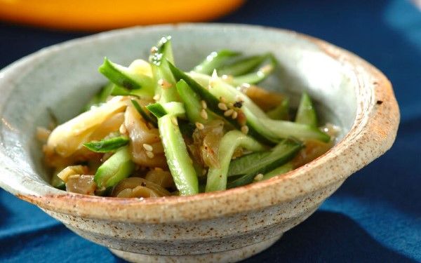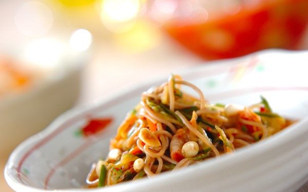 韓国で主流なドングリ粉を練り込んだ麺(冷麺用もしくは冷麺用中華)を使う、アレンジ小鉢です。糸こんにゃくに似た弾力があり、キムチとキュウリのシャキシャキ食感がいいアクセントに。お酒のおつまみにも◎です。