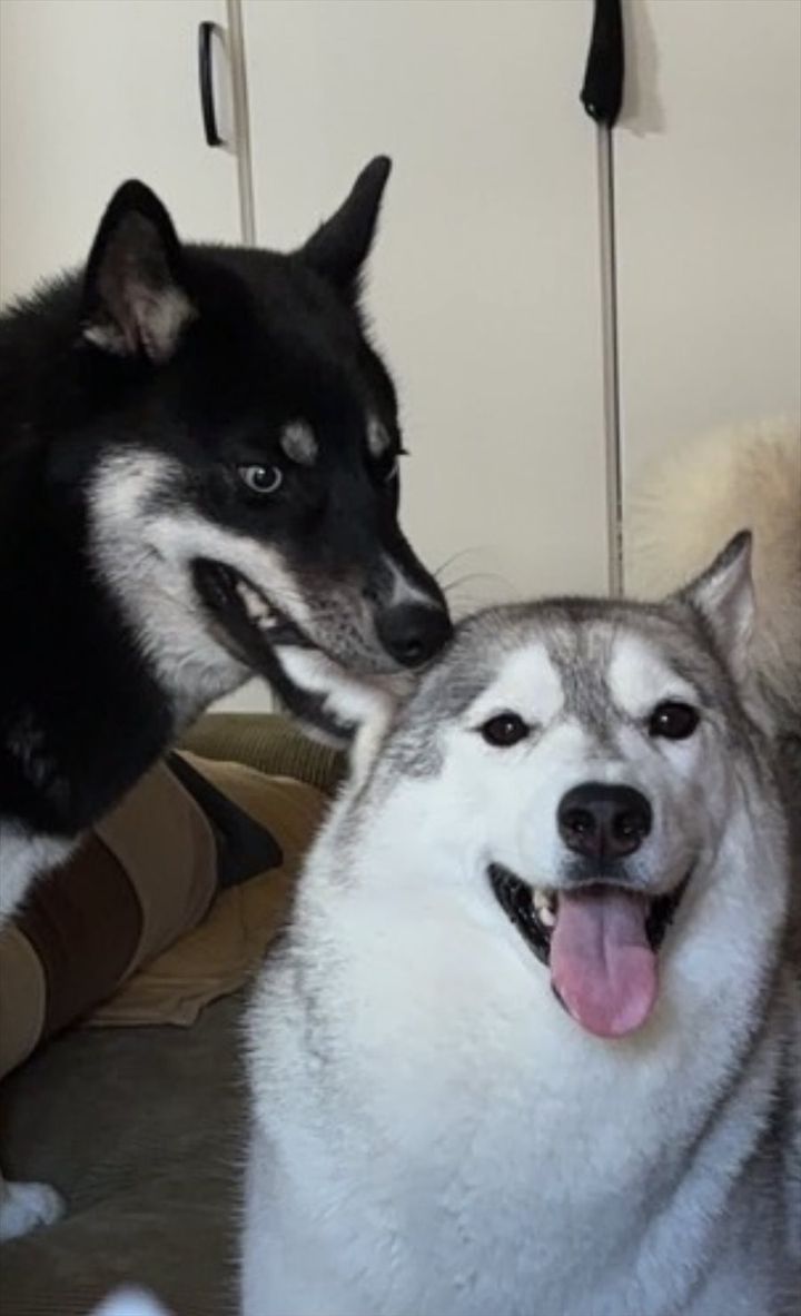ご紹介するのは、百福と壱福(@NISSHINmomofuku)さんがXに投稿された写真です。 ハスキー犬たちのある日の様子を公開されています。