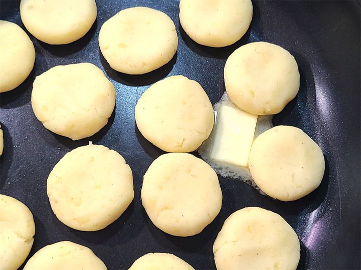 4. 丸く成形してフライパンに並べ、真ん中にバターを入れてから中火にかけます。バターが苦手な人は油で焼いて、完成した後に少しだけのせる程度でもおいしく食べられるそうですよ!
