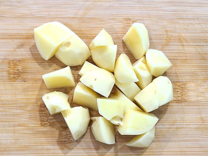 1. じゃがいもの皮をむき、乱切りにします。新じゃがは皮が薄いので、丸めたアルミホイルでこするだけでも皮がむけます!