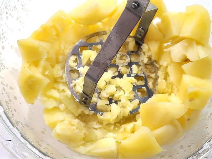 2. 耐熱容器にじゃがいもと水をいれ、600Wの電子レンジで6分半ほど加熱し、マッシャーで