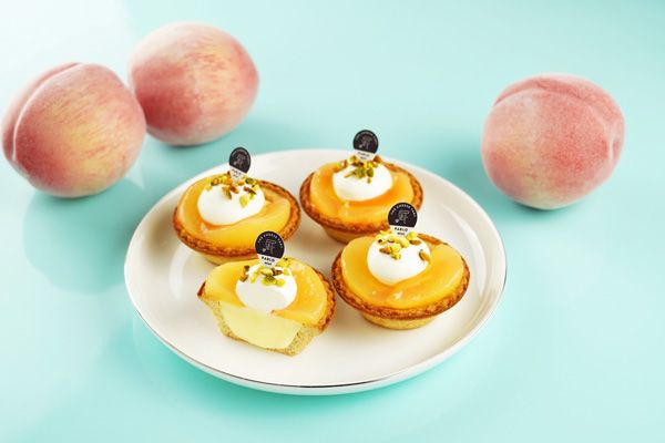こんがりと焼き上げたチーズタルトに桃のスライスを重ね、中心にヨーグルトホイップを絞り、ローストピスタチオをあしらっています。桃の甘い香りと果肉の食感、やわらかな甘さのヨーグルトホイップクリームでさわやかな味わい。キラキラと輝く桃とホイップクリームの涼やかな色合いが美しく、初夏の手土産にもぴったりです。