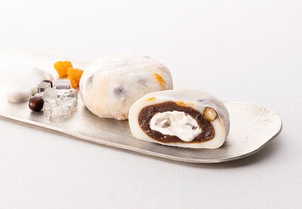 口いっぱいにあふれ出る黒蜜風味たっぷりのあんこと、とろっととろける純生クリームの相性は抜群。ぷりぷり弾けるさいの目寒天の食感も楽しめます。さらに、もちもちのお餅からはアンズや赤えんどう豆が現れるという欲張り仕立て。ひんやりつめたい大福をひとくち頬張れば、あんみつのおいしさが広がります。