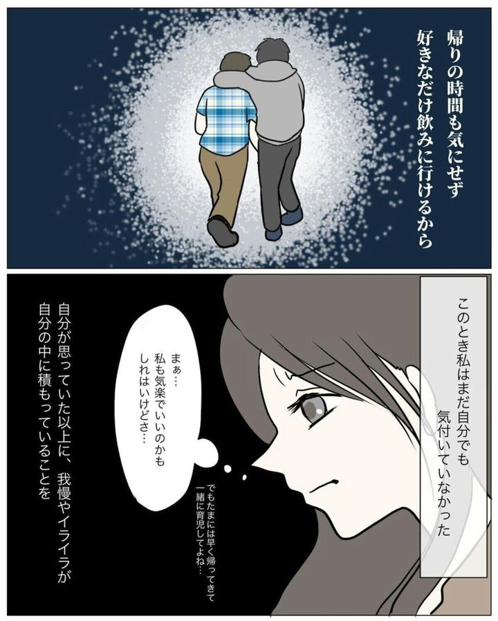 お互い、気にせず過ごすことができたら気楽でいい…とは思いつつも、やはり、夫にはたまには早く帰ってきてほしいと思ってしまいますね。イライラが少しずつ降り積もっていきます。