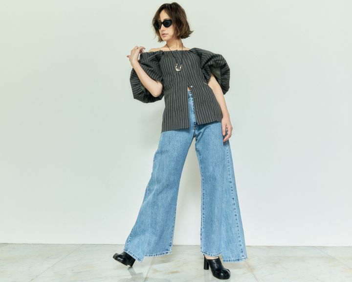 ブラウス¥26,400(プランクプロジェクト/プランクプロジェクト 青山店)、デニムパンツ¥72,600(イー エル ヴイ デニム/アパルトモン 青山店)、サングラス¥17,600(メシーウィークエンド)、ネックレス¥62,700(アグメス/共にハウス オブ ロータス)、リング¥90,200(ソフィー ブハイ/エスケーパーズ アナザーワールド)、サンダル¥134,200(JWアンダーソン/ROKU 青山)