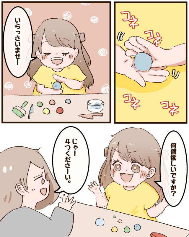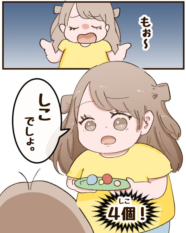 長女みーちゃん、長男はーくん、1歳7ヶ月差の年子姉弟のママである和栗ぐりさんから、数え方のお話です。みーちゃんとお店屋さんごっこをしていたときのこと、和栗ぐりさんがおだんごを4つ注文すると・・・。