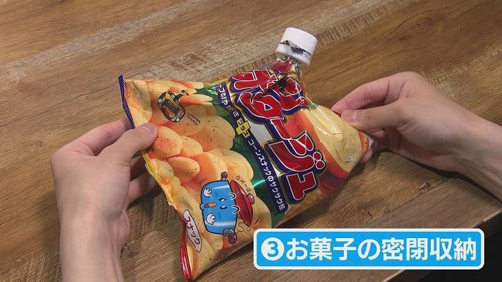 キャップの活用法③:キャップ部分をくりぬき、お菓子の袋を広げて、最後にキャップを締めれば…密封グッズに!