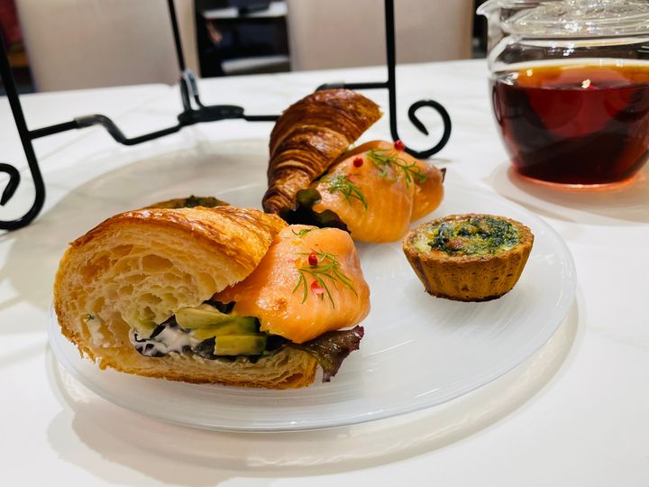 サーモンとアボカドをクロワッサンで挟んだサンドイッチとほうれん草とベーコンのキッシュ。