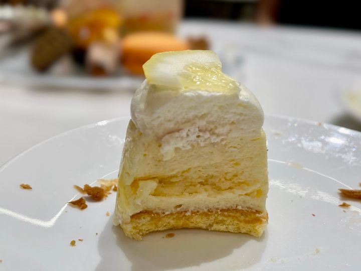 土台はカモミールとホワイトチョコのムース。カモミールの香りとホワイトチョコのまろやかな甘みのハーモニーが絶妙です。くちどけもよくこれだけでもとっても美味しい!