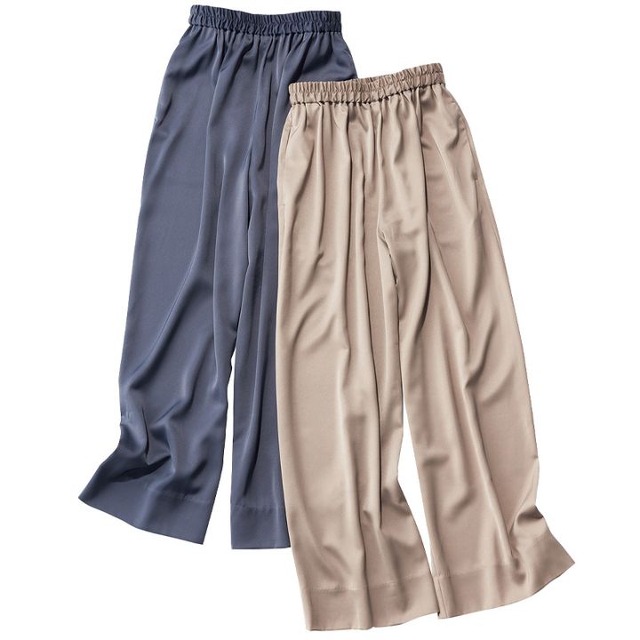 マットなサテン生地がデイリーに使いやすい。ウエストゴムで座りっぱなしもラク! サテンパンツ各¥19,800(ともにWRAY)
