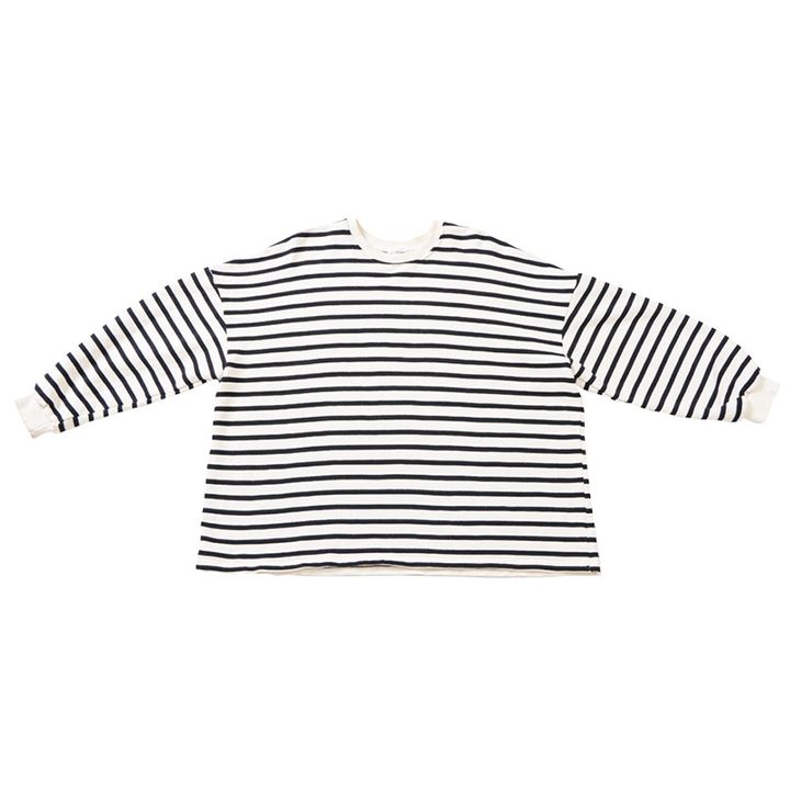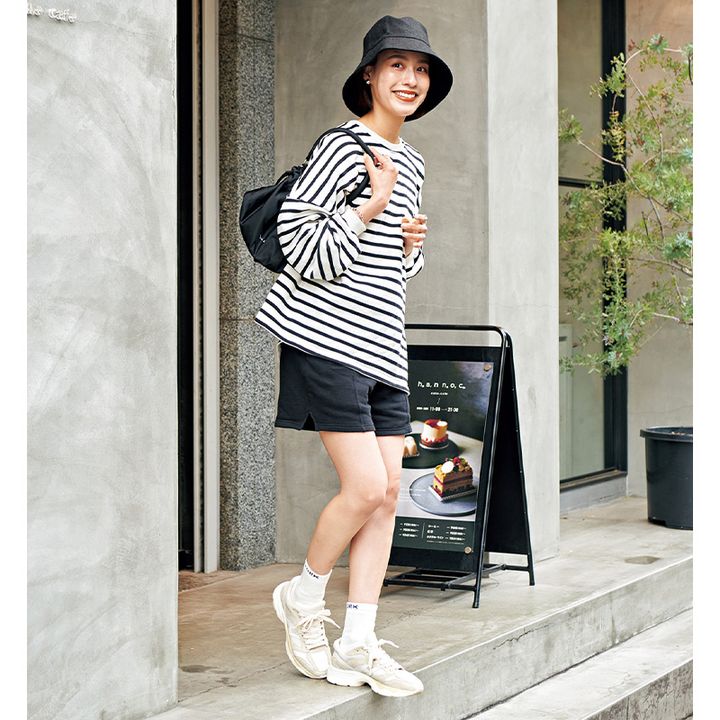 どんなスウェットも私はオーバーサイズ一択。今季のスウェットトップスは春夏の定番・ボーダー柄を選んで、coxcoのショーパン×スニーカーでスポーティにまとめます。インスタで話題のパティスリー&カフェなので、カジュアル強めが場所の雰囲気に馴染みそう。