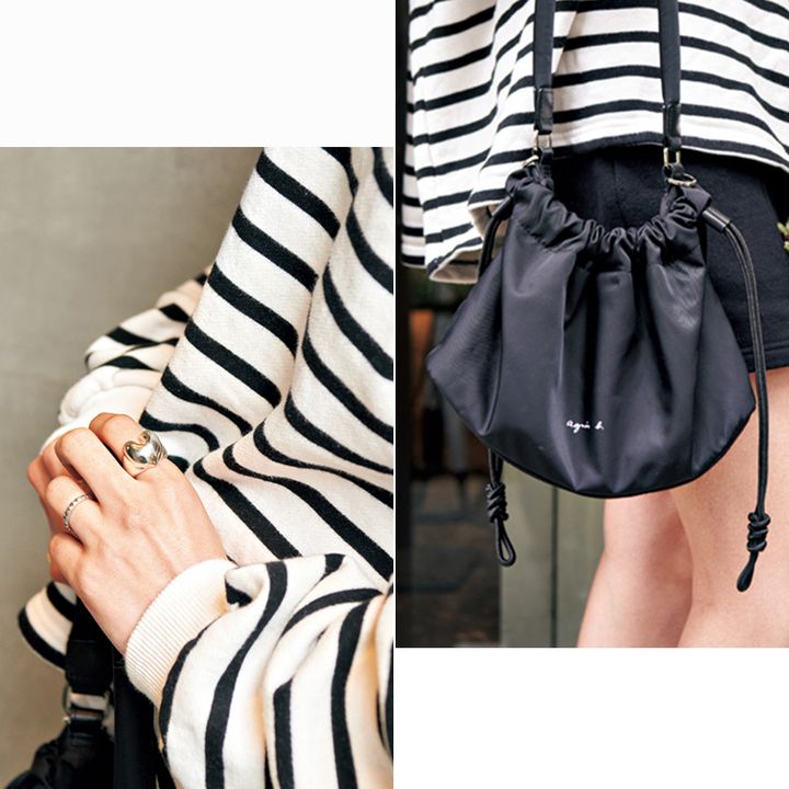 ネットで買ったCHIEKOのハートのシルバーリングとアニエスb.のクシュッとしたバッグで遊び心を加えました。