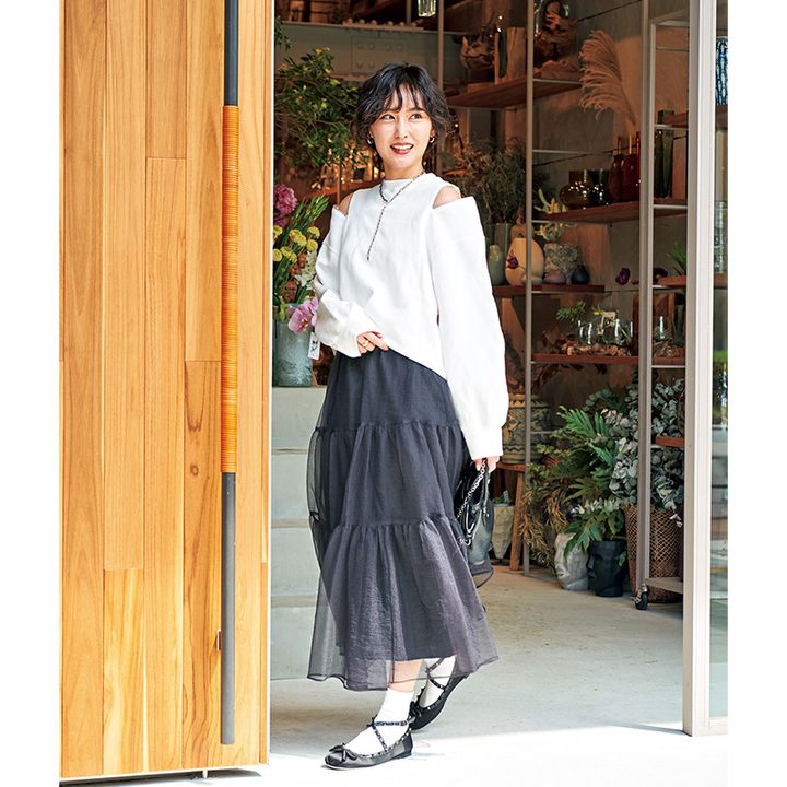 天井までお花がいっぱいのフラワーショップはオシャレな人たちが買いに来ているから、気が抜けません。スウェットトップスはジッパーで肌見せできてモードに仕上がるから、私にとってここぞの日の優秀アイテム。EJINのチュールスカートでやわらかい雰囲気を加えました。