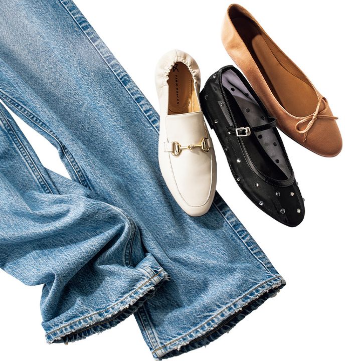 デニム¥27,500(アッパーハイツ/デミルクス ビームス 新宿)バレエシューズ[H0.7]¥38,500(フラッタード/ショールーム ロイト)メリージェーン[H0.8]¥22,000(ユナイテッドアローズ/ユナイテッドアローズ 六本木ヒルズ店)ローファー[H0.8]¥39,600(ファビオ ルスコーニ/ファビオ ルスコーニ ルミネ有楽町店)