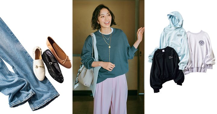 スウェットトップス&デニムパンツ 2大普段着アイテムも、選び&コーディネートで きれいめ学校スタイルが叶う!