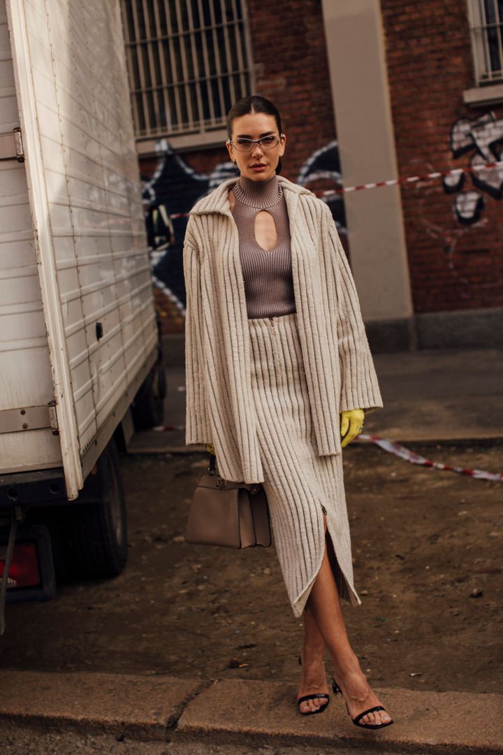 ジョン・レノン? ハリー・ポッター? そんなイメージが先行する真ん丸レンズ眼鏡も、なぜかおしゃれに見える不思議。ワントーンのスタイリングやジュエリー使いを見習って。