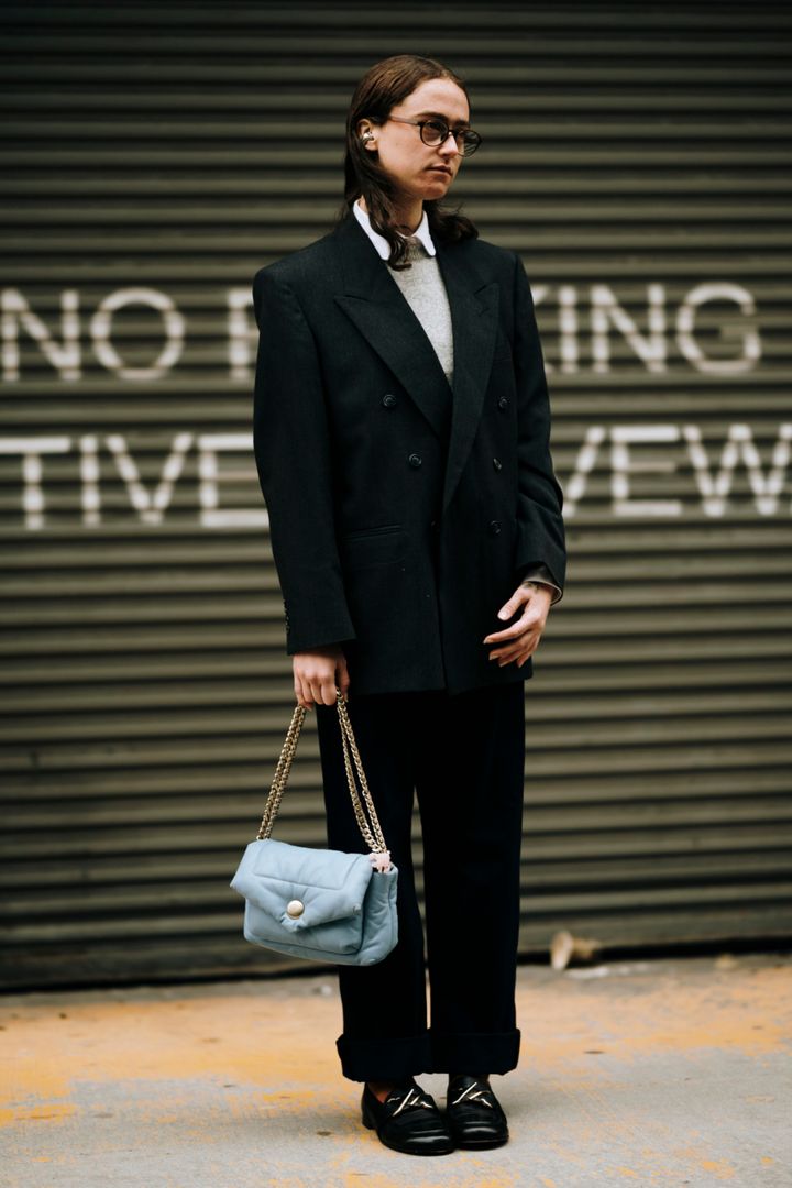 マニッシュなダブル仕立てのスーツには、90年代を彷彿とさせるオーバル型の眼鏡をチョイスして、とことんクラシックな着こなしに。パフィーなアイスブルーのバッグや丸襟のシャツなど、レディなエッセンスも忘れずに。