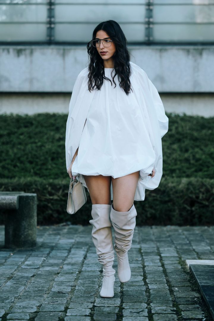 シャツドレスにロングブーツのガーリーな着こなしにも、眼鏡をプラスするだけでぐっと洒落たムードを纏える。