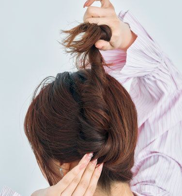 襟足で髪を1つに集め、上に引っ張りながらきつめにねじる。根元がたるまないよう、ぎゅっとねじって。