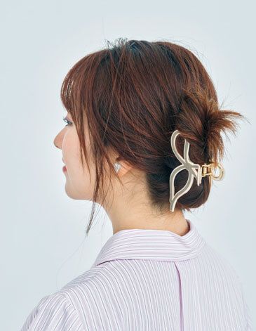 韓国女優っぽい大人の余裕が出るヘア。きっちりまとめすぎないことがこなれ見えのコツなので、耳上やトップにはゆとりをもたせて。はさむだけなのでお直しも簡単!