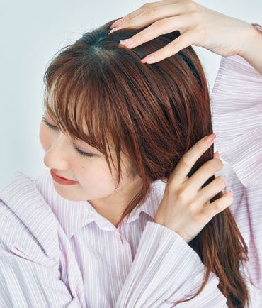 トップをいつもの分け目と逆側に流し、ふっくら感を出す。髪がまとまりにくい人は中間〜毛先にワックスを。
