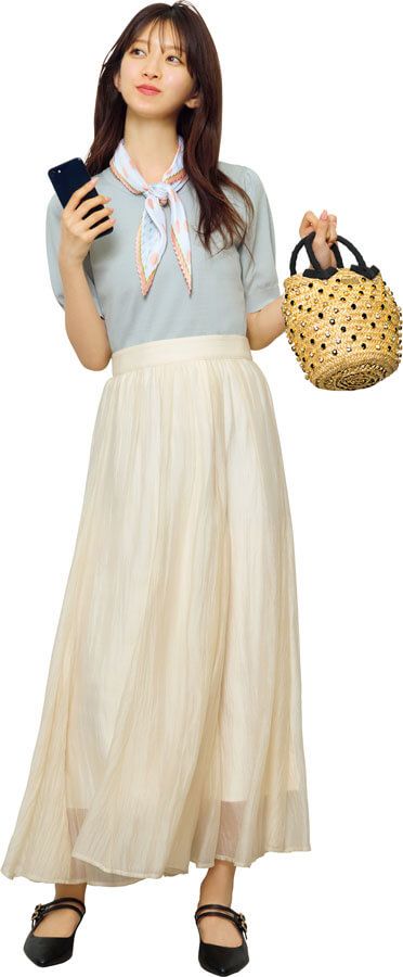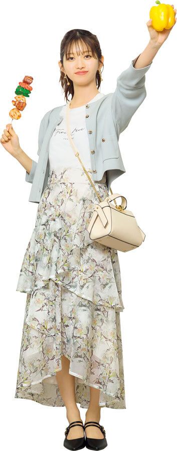 アンサンブル(カーデのみ着用)¥20,900/レッセ・パッセ Tシャツ¥2,748/grove(ワールドプレスインフォメーション) スカート¥15,400/MERCURYDUO(MERCURYDUO ルミネエスト新宿店) イヤリング¥ 34,100/Grosse(グロッセ・ジャパン) バッグ¥17,600/ダイアナ(ダイアナ 銀座本店) ミュール¥13,750/Noëla