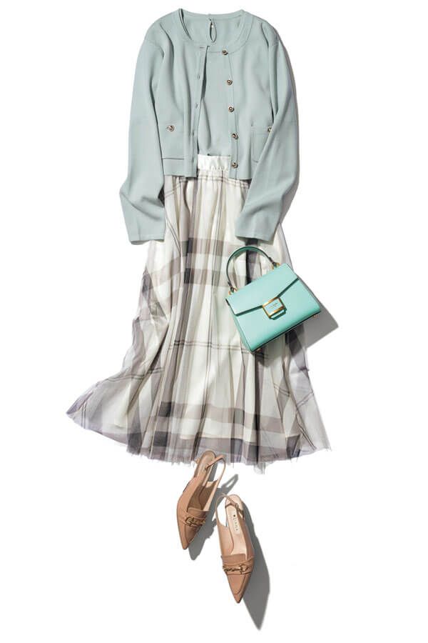 アンサンブルとバッグはミントカラー、スカートのチェック柄とパンプスはベージュ系でそろえてまとまりよく。どちらも糖分控えめなので、通勤仕様のきちんと感がしっかり。