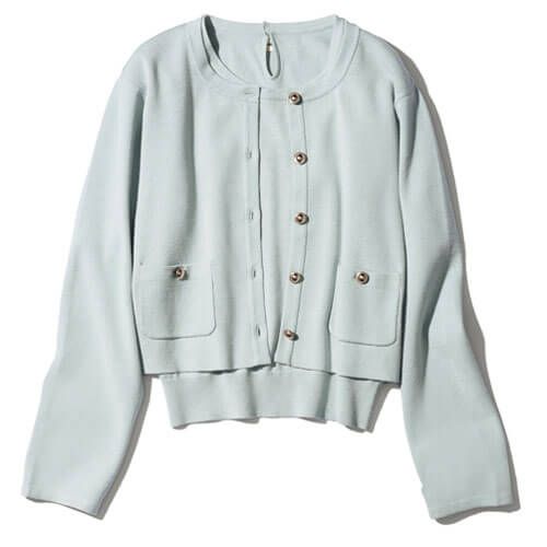カーデと半袖ニットは単品使いでも大活躍。さわやかな色みの清潔感で、オフィスでの好感度UP。カーデは今年旬の短めな丈感です。