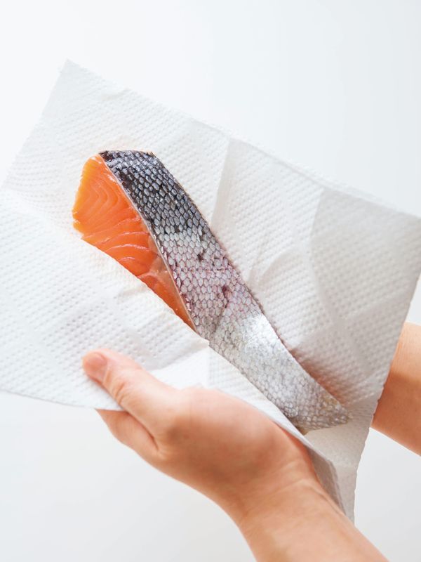 (1)鮭の水けを拭き取る
