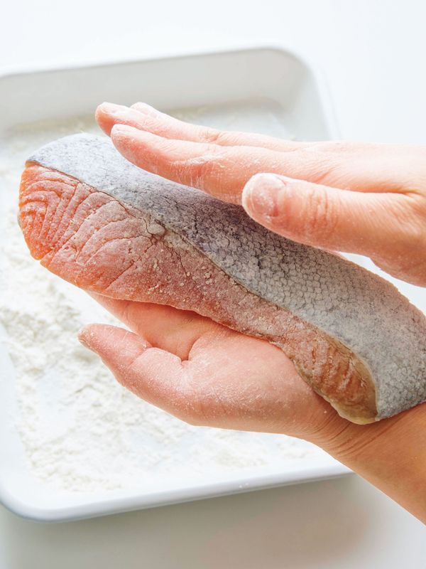 (2)鮭に小麦粉をまぶす