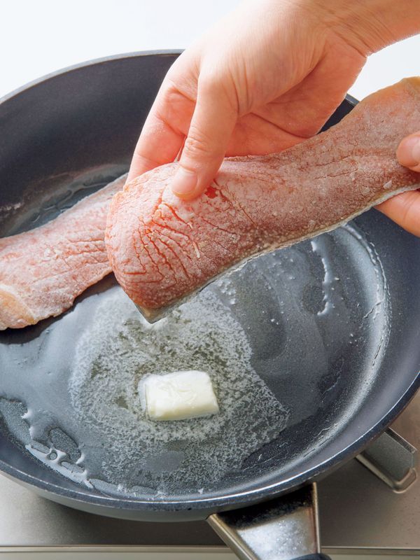 フライパンにバター30g、サラダ油少々を入れて中火にかける。バターが2/3ほど溶けたら、鮭を盛りつけるときに上になるほうを下にして入れる。