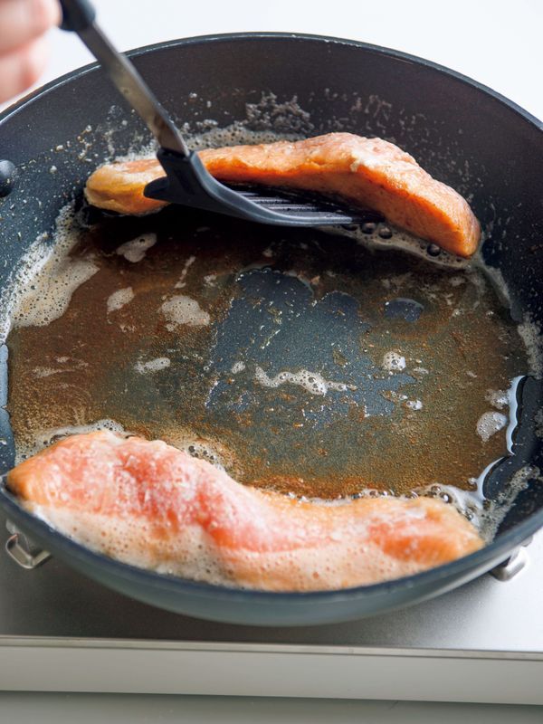 鮭にスプーンで焼き汁をかけながら、さらに弱火で1~2分焼き、器に盛る。フライパンに残った焼き汁をかける。