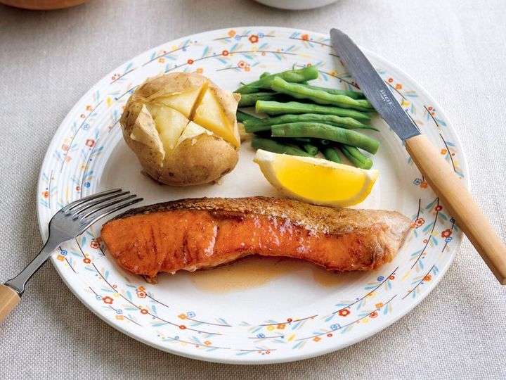 シンプルなメニューだけに、ちょっとしたことで味が驚くほど変わる「鮭のムニエル」。電子レンジでチンしたじゃがいもやいんげんなど野菜をつけ合わせ、お好みでレモンを絞ってめしあがれ!