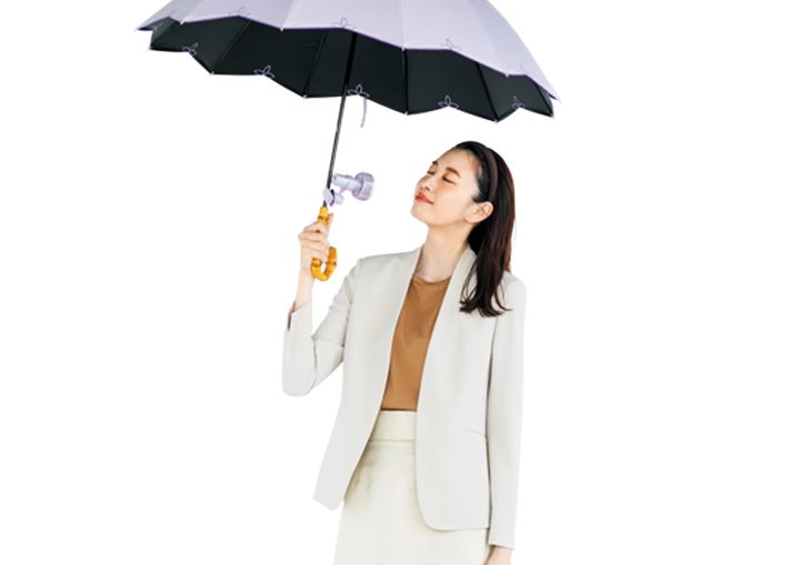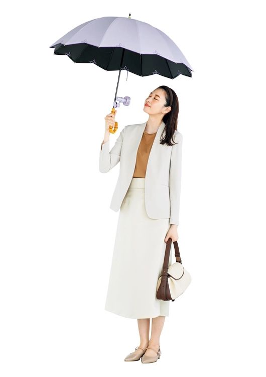 キャメルカットソー¥9,900/IKITSUKE(IKITSUKE笹塚店) ハイウエストスカート¥22,000/ルーニィ ジャケット¥18,700/グリーンレーベル リラクシング(ユナイテッドアローズ グリーンレーベル リラクシング ルミネ有楽町店) ハンドバッグ¥16,500/ル・ベルニ(キャセリーニ) メリージェーン(晴雨兼用)¥23,100/銀座かねまつ(銀座かねまつ6丁目本店) 傘(晴雨兼用)¥6,600/Wpc.(ワールドパーティー) カチューシャ¥22,000/アレクサンドル ドゥ パリ(アレクサンドル ドゥ パリ GINZA SIX店) フレ ミニファン¥2,980/フランフラン