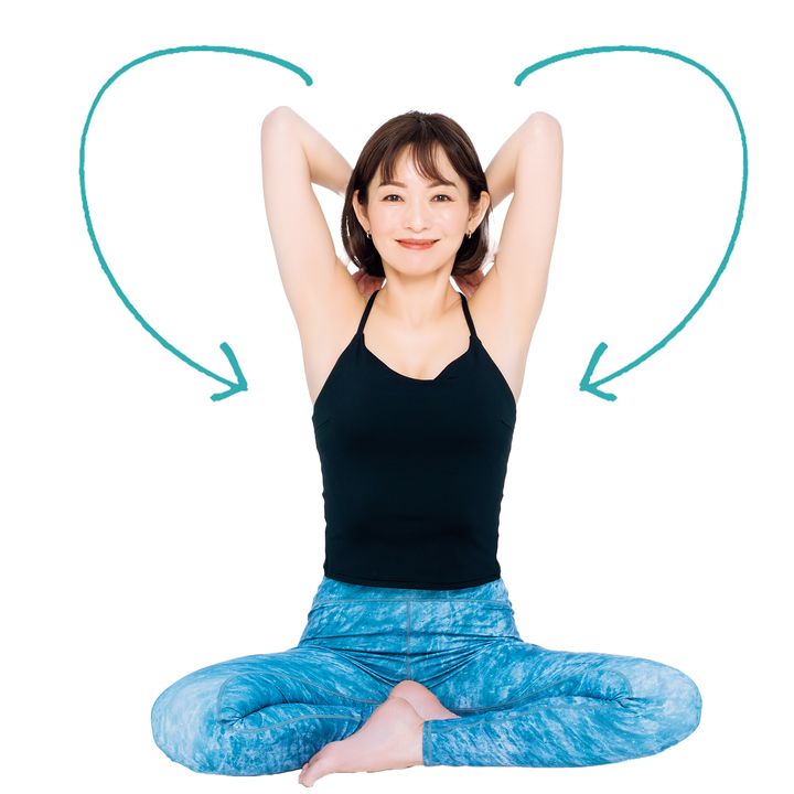肩を大きく回すことで肩甲骨がほぐれてなめらかに動かせるように。胸が開いて、猫背も解消します。さらに二の腕も引き締まり、肩こりの解消にも効果的なストレッチ。