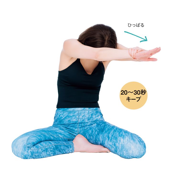 左手で右手首を持って、左斜め前方にグーッと引っ張ります。息を吐きながらゆっくり頭を下げつつ背中を丸めて、背中から肩が気持ちよく伸びるのを意識して。そのまま20~30秒キープします。左右1回ずつ行います。