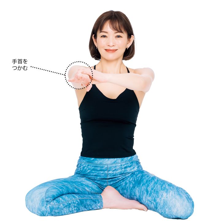 左足の太ももに右足の裏をフィットさせて横座りをします。両腕を前方にまっすぐ伸ばして左手で右手の手首をつかみます。骨盤がずれないように注意を。