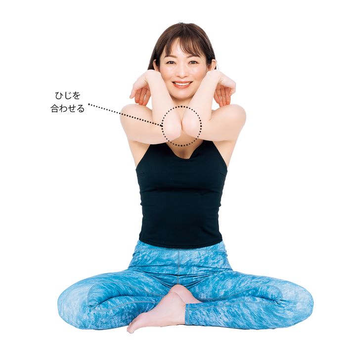 床にあぐらで座ります。指先を肩にちょんと乗せて固定。その状態で左右のひじを胸の前で合わせます。