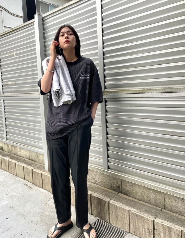 「メンズブランドのTシャツを大きめサイズで着用し、ラフになり過ぎないようにレザーのパンツでバランスを取りました。Tシャツは一見シンプルながら、ボーダー柄や刺繍ロゴ、リンガーネックなど細かいポイントがきいていてお気に入り。スタイルをこなれたムードに仕上げてくれます」