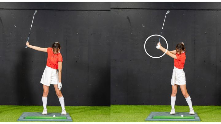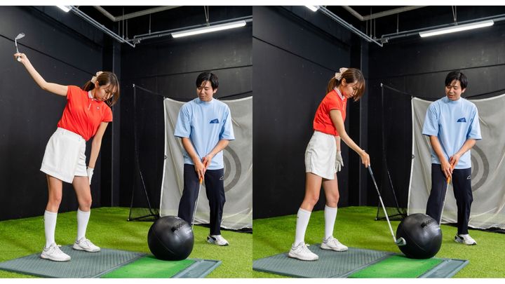 改善するためにはクラブを最初から右手1本で持ちます。重く感じる人はクラブを短く握ってみましょう。今度はインパクトバッグを強く叩けるなと思う位置にクラブを上げてください。実際に何度か叩いてみて、どの位置に右手を上げれば最も強く叩けるのかを確認しましょう。その位置が分かったら、クラブに左手を添えて両手で握ります。同じようにインパクトバッグを強く叩ければOKです。