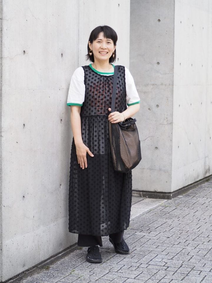 袖や衿まわりのパイピングがきいたポップなTシャツに、レースのワンピースをレイヤード。「単体で着るとかなり派手なTシャツも、こうすればインパクトが和らぐかなと。購入したタイミングが遅くて去年は1回しか着られなかったので、今年はTシャツに限らずいろいろな組み合わせを試してみたいです!」