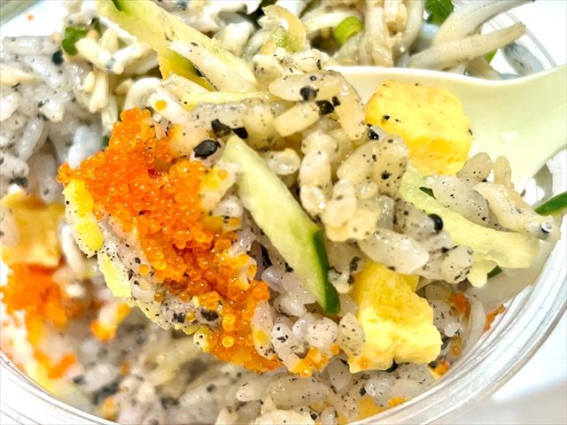 ふわふわのしらすに、たくわんやキュウリのシャキシャキ、とびっこのつぶつぶといった、いろいろな食感を味わうことができます。